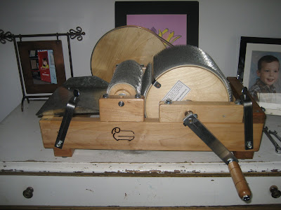Nothing says Happy Birthday like a drum carder! I was fortunate to receive this beautiful Deb's Deluxe drum carder from my loving husband. As you might have noticed I have been enjoying the beautiful batts I have purchased on Etsy. So now that I have this carder I am able to attempt to make a few of my own. I will however not abandon my favorite sellers for their batts are beyond luscious and the amount of work they put into each batt, picking the fibers, dyeing them and then making the stunning batts is incredible.